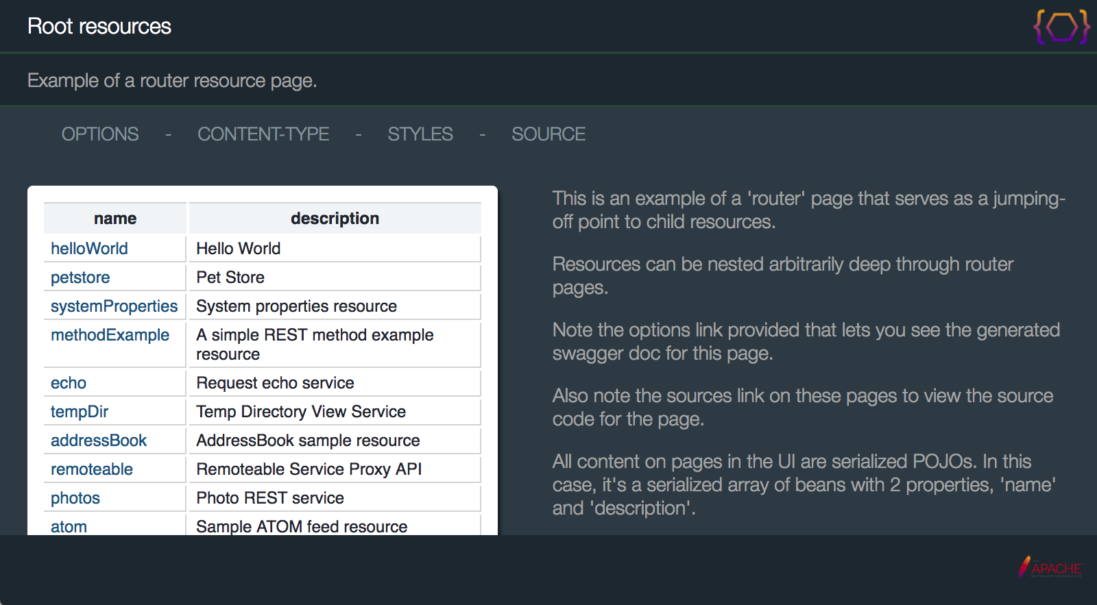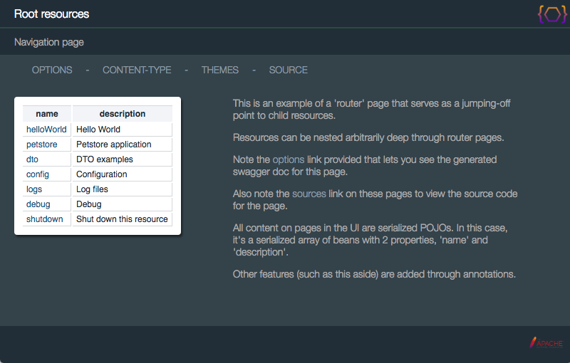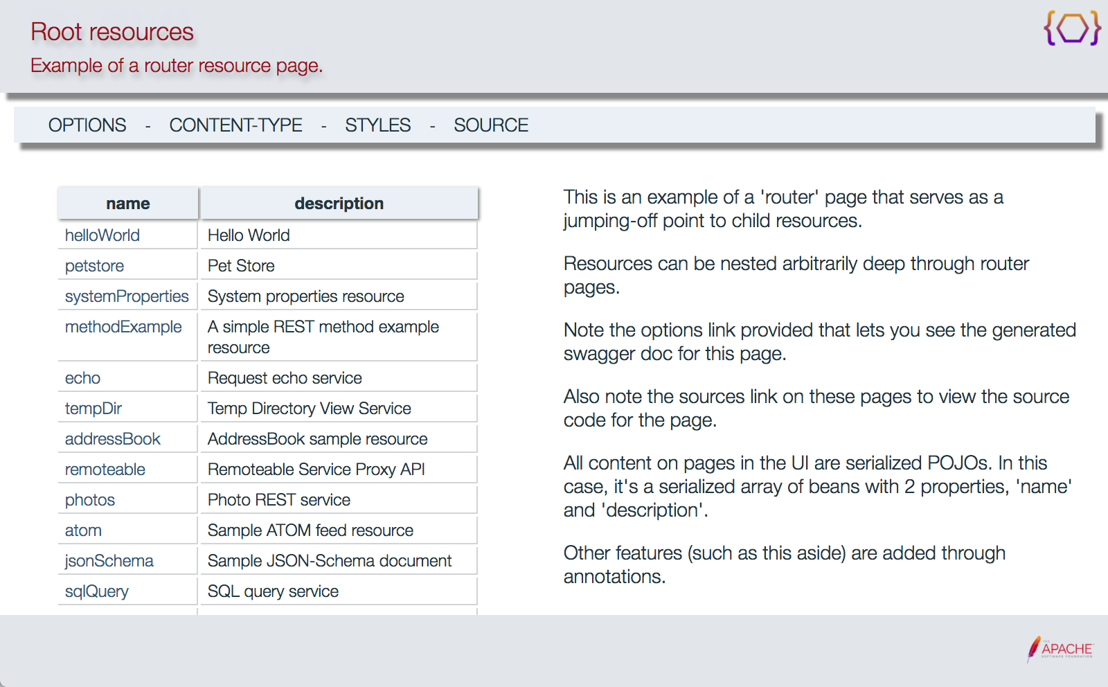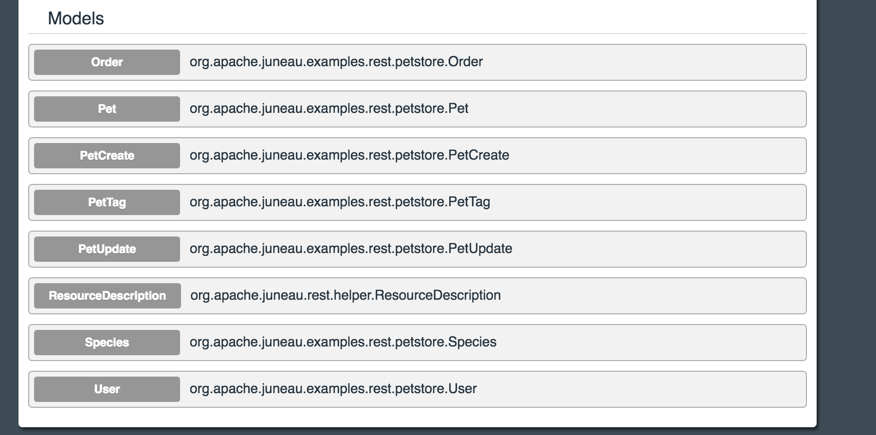 | Juneau REST | juneau-rest-server | A universal REST server API for creating Swagger-based self-documenting REST interfaces using POJOs, simply deployed as one or more top-level servlets in any Servlet 3.1.0+ container. |