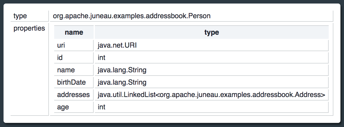 One of the goals of Juneau was to make serialization as simple as possible. In a single line of code, you should be able to serialize and parse most POJOs. Despite this simplicity, Juneau provides lots of extensibility and configuration properties for tailoring how POJOs are serialized and parsed.