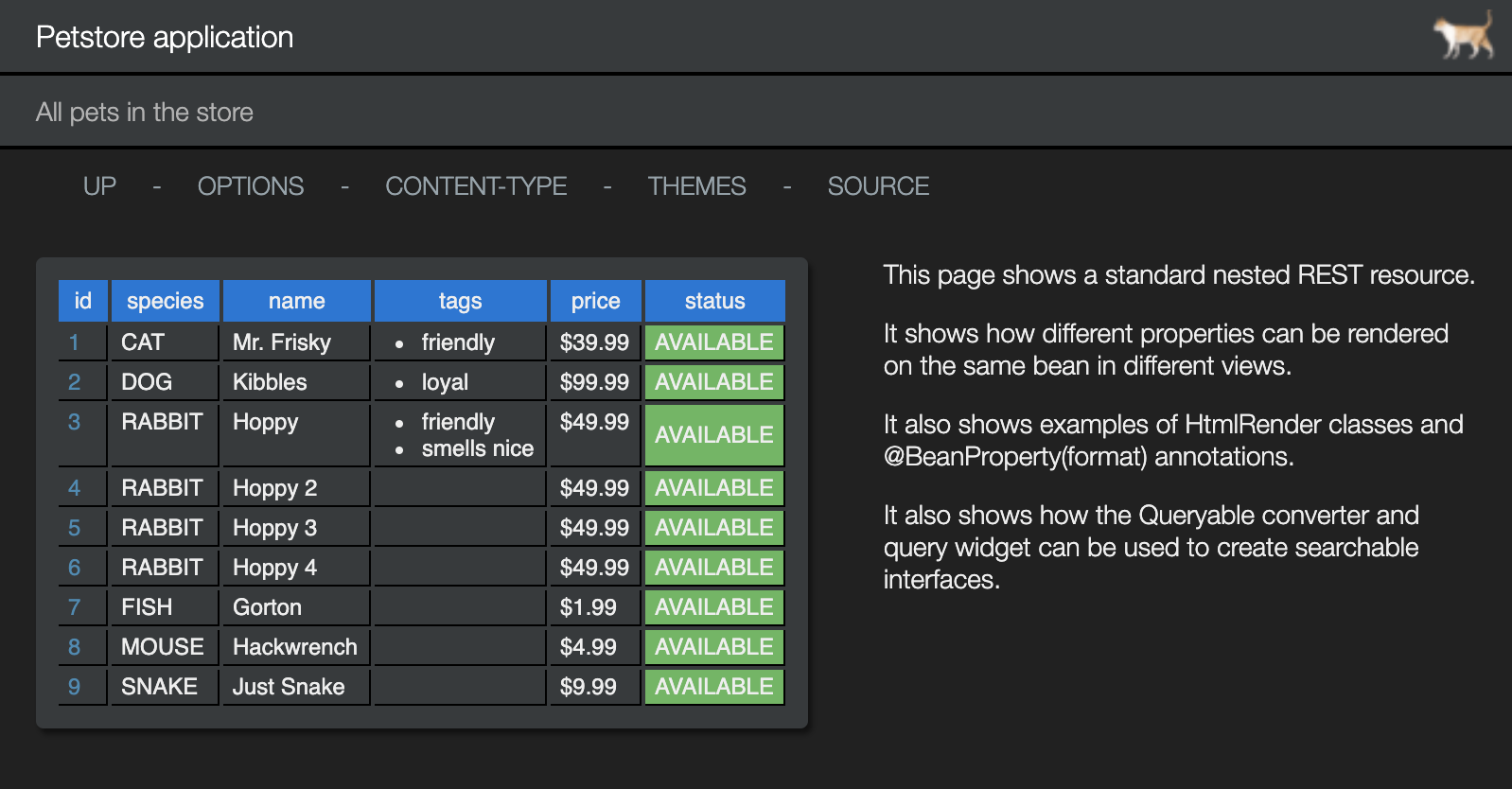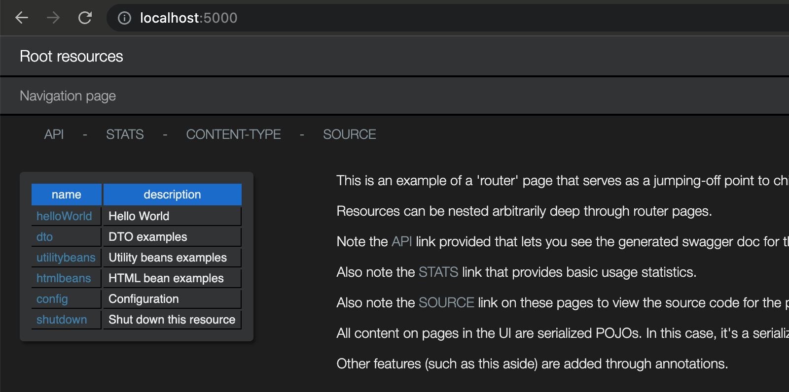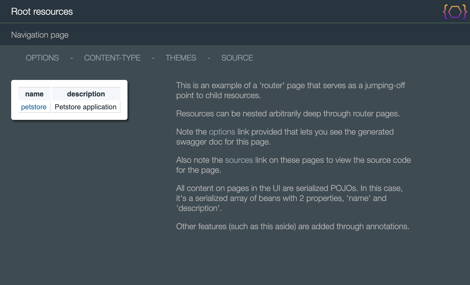 // A root resource that supports JSON/HTML marshalling. public class MyRootResourcesextends BasicRestServletGroup { ... }// A child resource that supports all available marshalling. public class MyChildResourceextends BasicRestObject { ... }